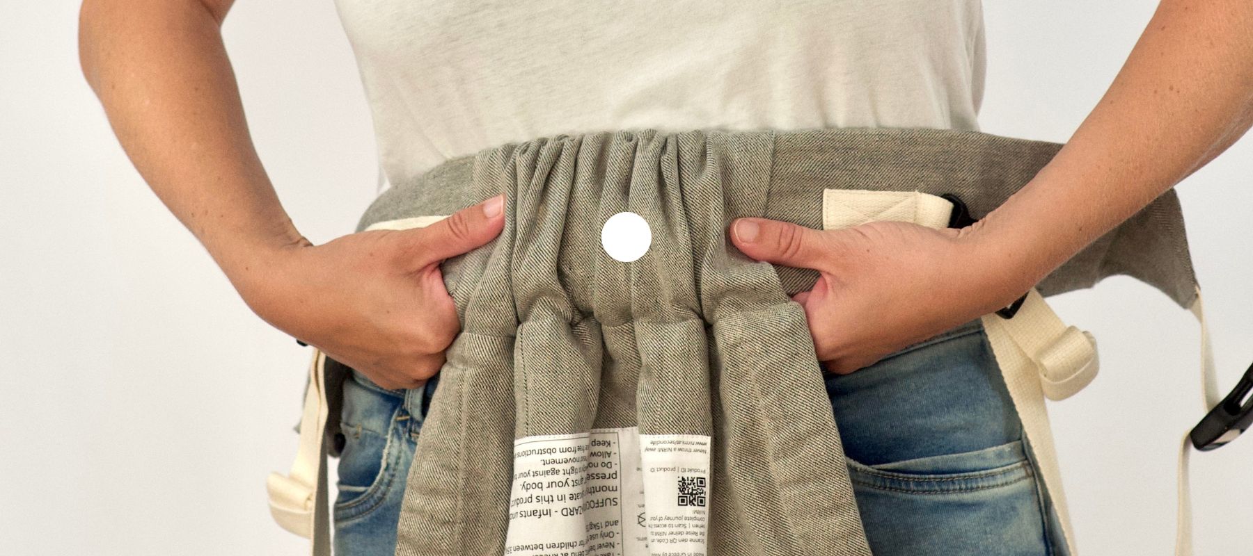 Die natürliche Babytrage aus 100 % Leinendenim von der österreichischen Traditionsweberei Vieböck, mit einer Polsterung aus Wollfilz vom Tiroler Steinschaf und Baumwollgurtbändern.